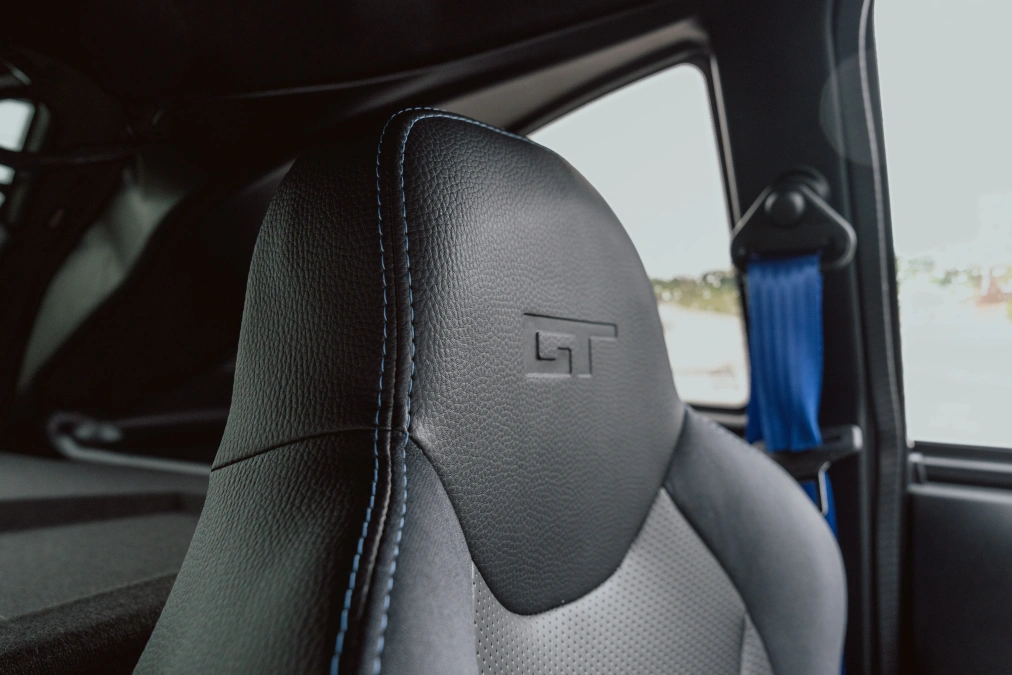 | Επένδυση εσωτερικού "GT" με μπλε ραφές και το σήμα GT ανάγλυφο στα προσκέφαλα |